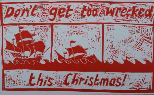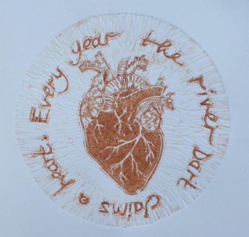 EVERY YEAR THE RIVER DART CLAIMS A HEART - MUD LINOCUT PRINT £90 FRAMED £50 UNFRAMED